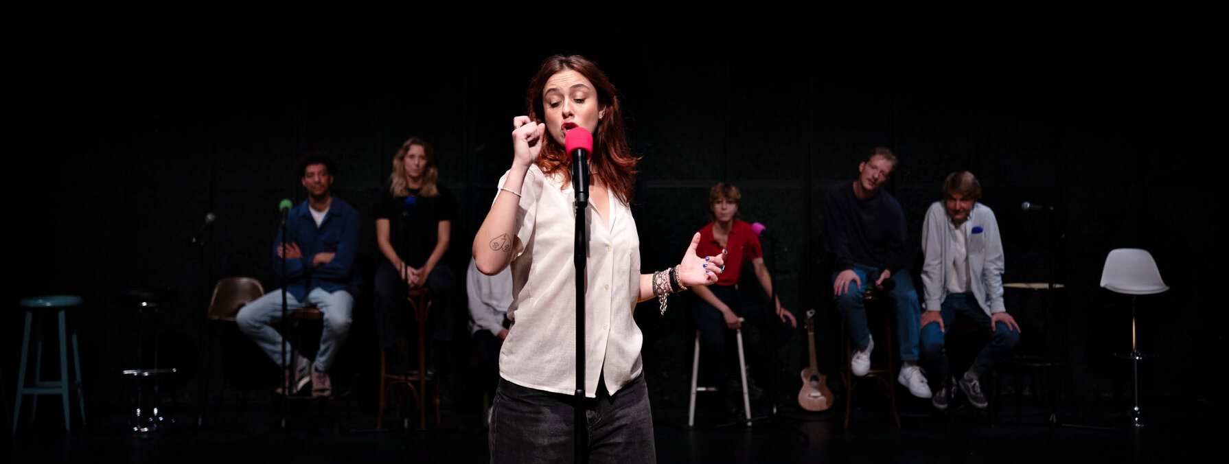 Les huit jeunes talents réunis ici témoignent de leur travail rigoureux reposant sur l’impertinence et la prise de risque. Chaque interprète se succède selon le rituel du comedy club, avant que la partition chorale prenne le dessus. Après les histoires intimes, c’est alors l’histoire du stand-up et sa dimension politique qui nous parviennent dans leur insolente évidence.