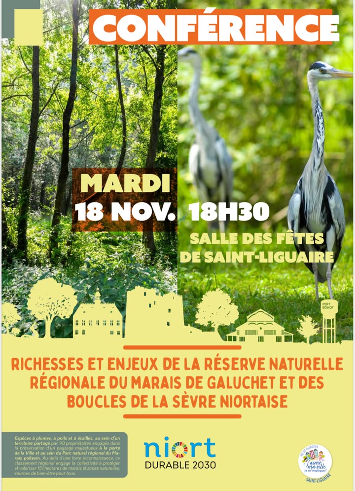 La Vie de quartier de Saint-Liguaire a organisé le 18 novembre dernier une conférence consacrée aux enjeux et richesses de la Réserve naturelle régionale du marais de Galuchet et des boucles de la Sèvre niortaise. 72 participants sont venus s'informer sur l'histoire, la biodiversité et les enjeux de la gestion collective de ce site remarquable. Habitants, associations, agriculteurs et acteurs du territoire se mobilisent pour l'avenir de ce précieux éco-système. #NiortDurable2030 Ville de Niort #DeuxSèvresNatureEnvironnement #groupeornithologique79