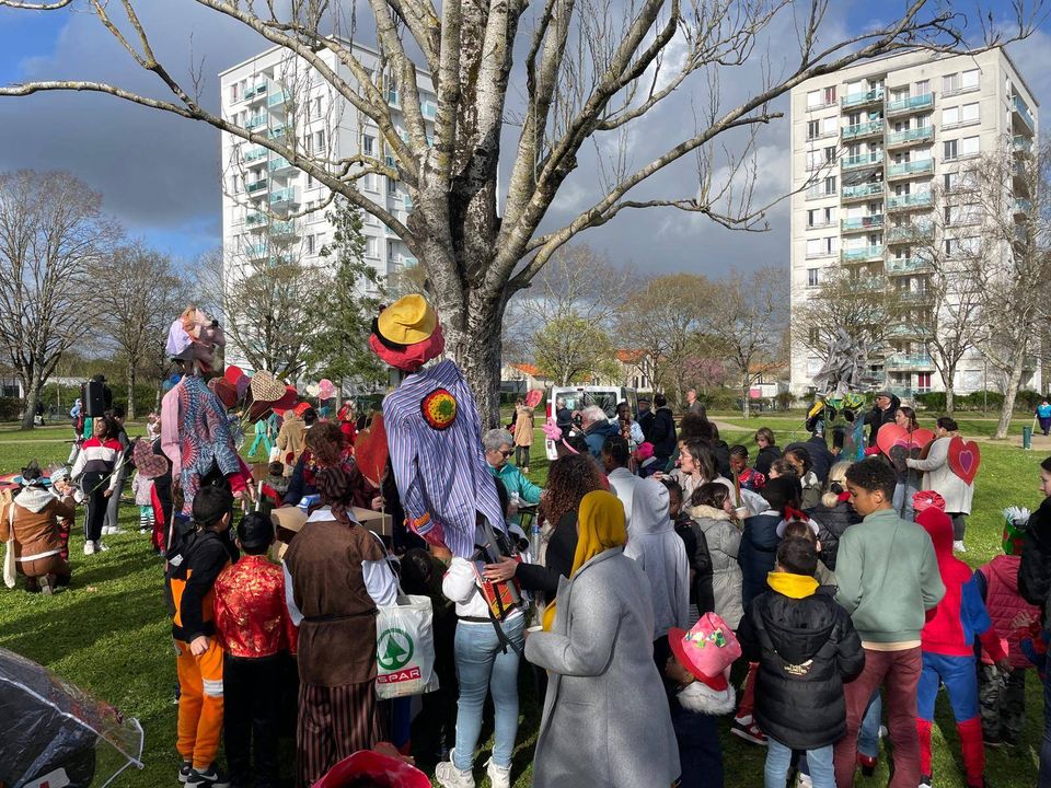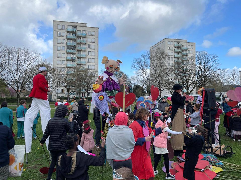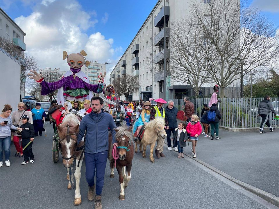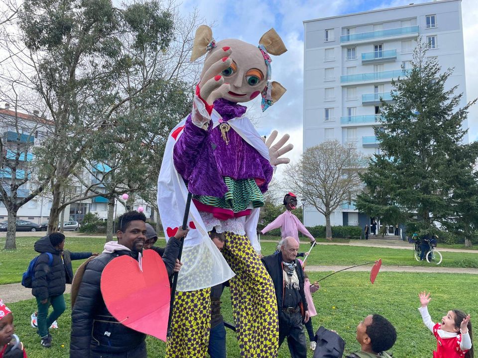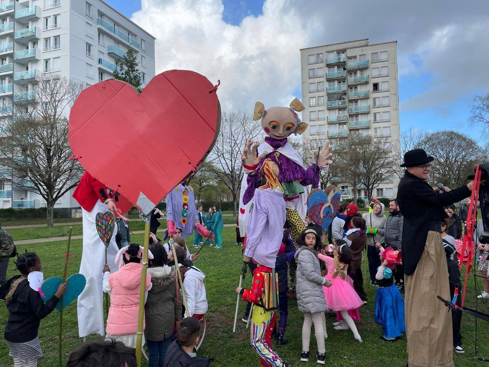 Carnaval du quartier de la Tour Chabot : après des semaines de préparation par les habitants et le centre socioculturel, voici venu le grand jour du retour de la marionnette géante Galuchette 😀 Belle déambulation en fanfare dans le quartier cet après-midi !