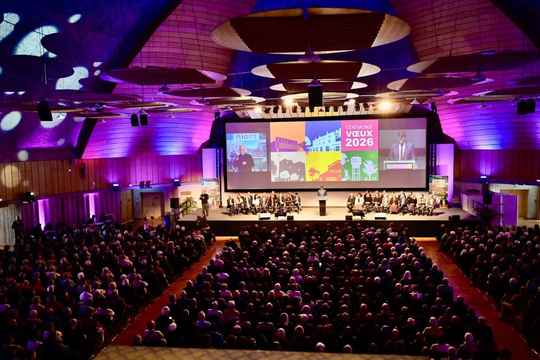 AccueilActualités de la ville de Niort Cérémonie des vœux aux Niortais à Noron :Cérémonie des vœux aux Niortais à Noron#Niort Ce samedi 10 janvier, le maire, Jérôme Baloge et l’équipe municipale, adressent leurs #voeux aux Niortais pour cette nouvelle année au parc des expositions de Noron.Publié le 10/01/2026Galerie photos/vidéos