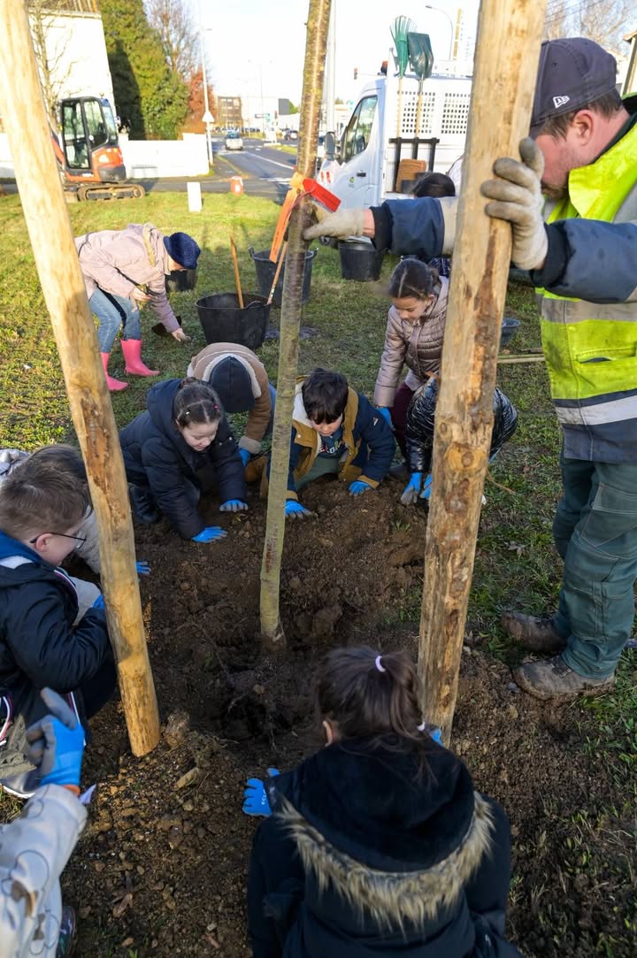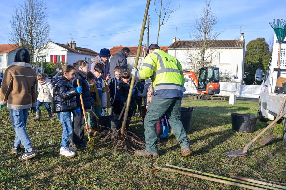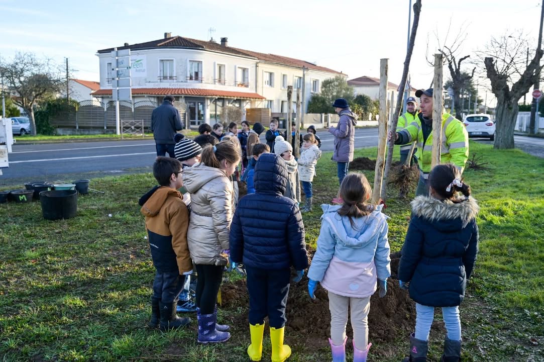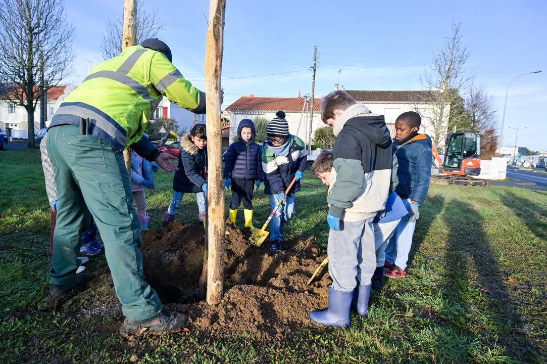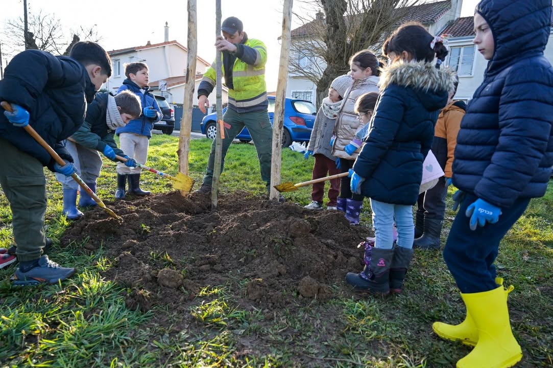 Les plantations d'arbres se poursuivent dans les quartiers, dans le cadre du programme Niort Canopée. Ici, place Dominique Arago à Saint-Florent, les élÚves de l'école Pasteur ont participé aux cÎtés des jardiniers de la ville à la plantation de cinq cerisiers du Japon.