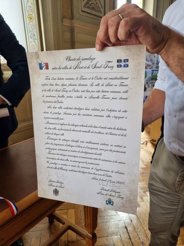 Ce lundi 23 juin, la Ville de Niort et la Ville de Sorel-Tracy au #Québec ont signé une charte de jumelage. Les deux villes sont liées par leur histoire commune par le biais de nombreuses familles de notre territoire parties s'établir en Nouvelle-France pour devenir les pionniers du Québec.