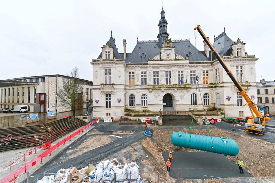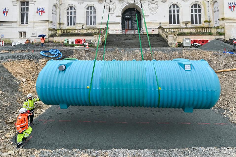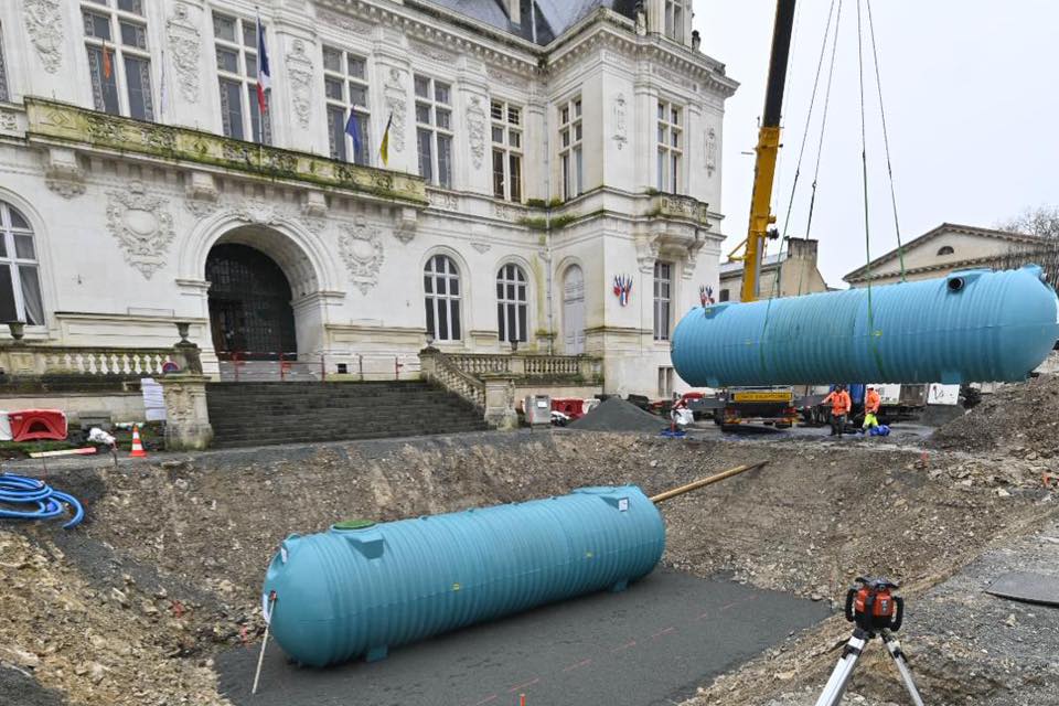 Ce matin, deux cuves de récupération des eaux de pluie de 40 m3 chacune ont été installées sous la place Martin-Bastard. Elles permettront d’arroser les futurs espaces végétalisés en cas de fortes chaleurs et de créer un nouvel îlot de fraîcheur en cœur de #Ville à #Niort