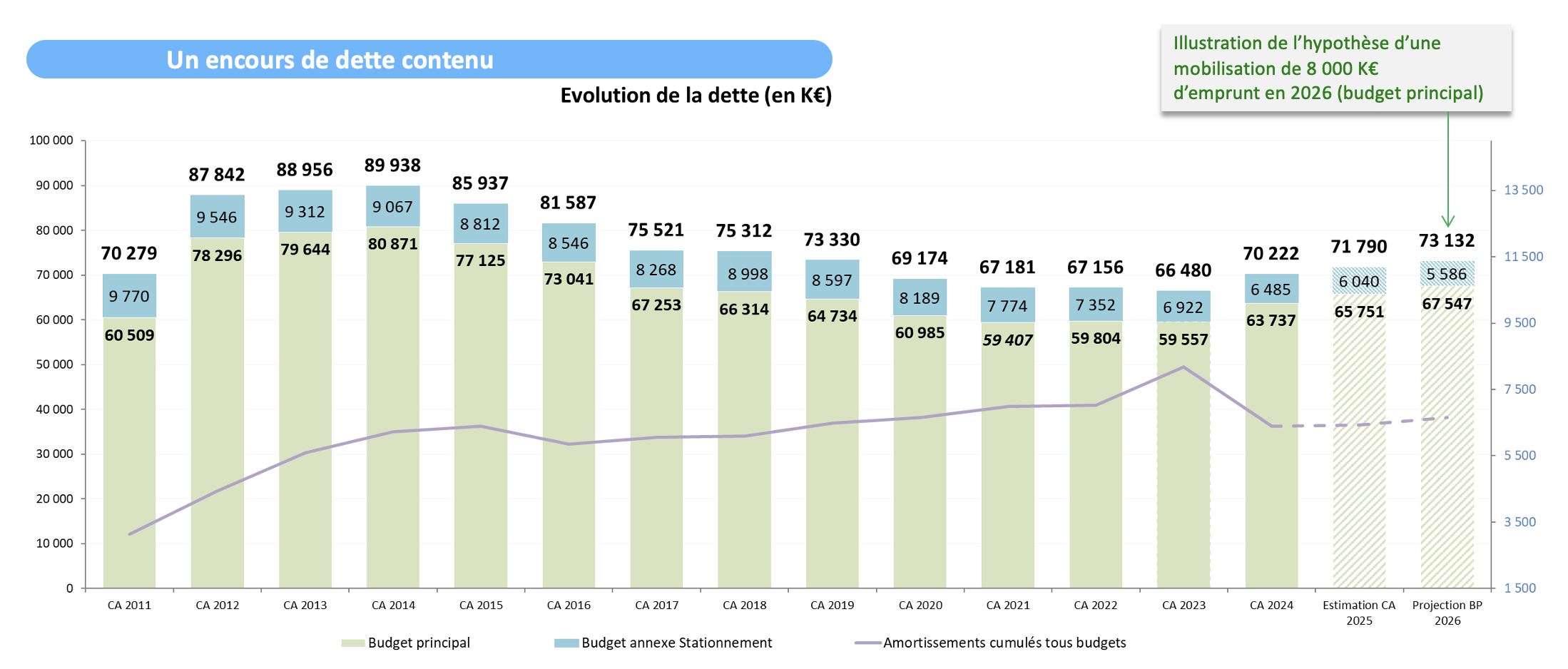 Hypothèse 2026 : mobilisation d’un emprunt de 8 000 K€ sur le budget principal.