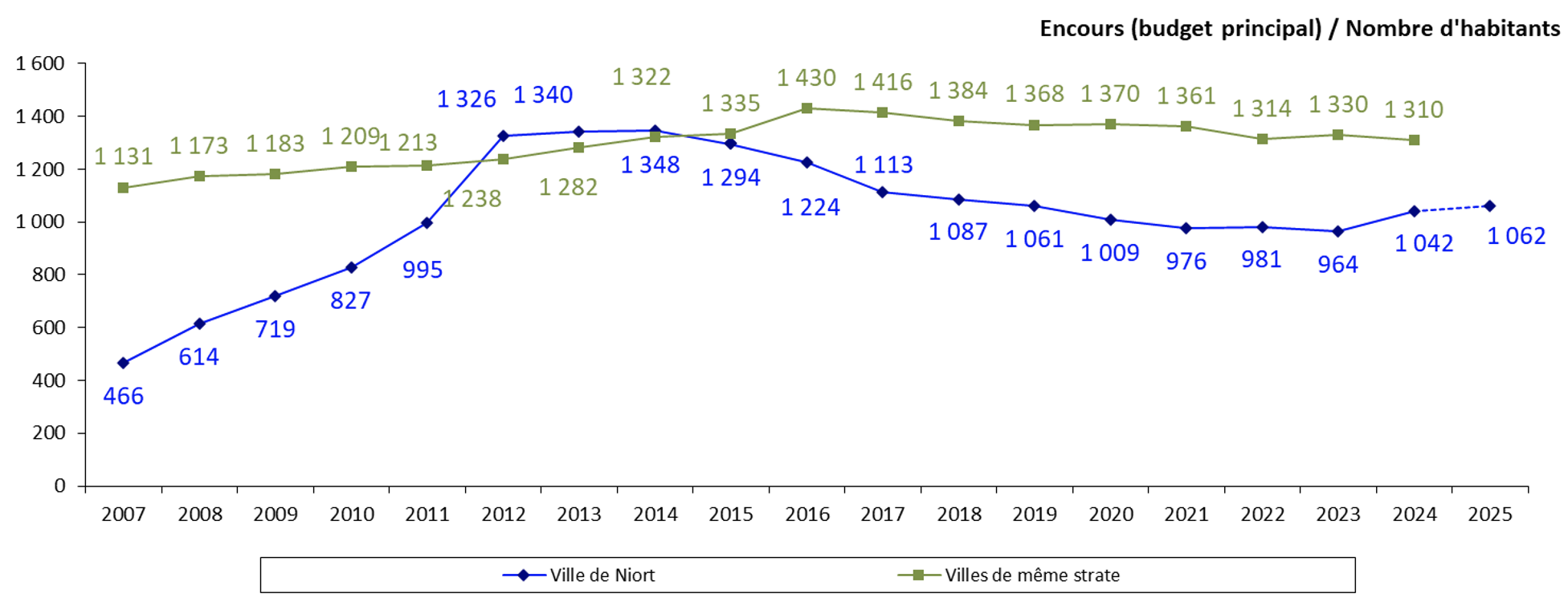 | Année | Ville de Niort (€ / hab.) | Villes de même strate (€ / hab.) |