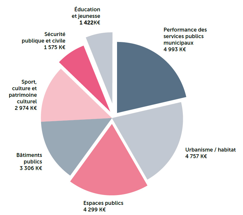 Le maintien d’une politique d’investissement en faveur du cadre de vie et des services publics municipaux : 23 546 K€ de dépenses d’investissement.