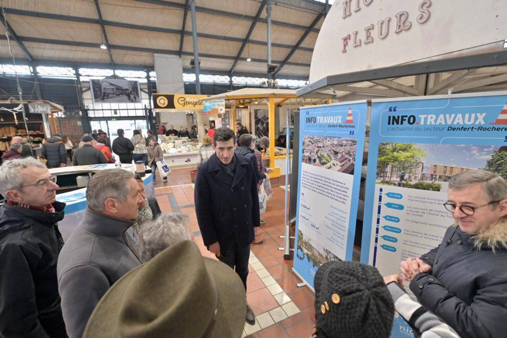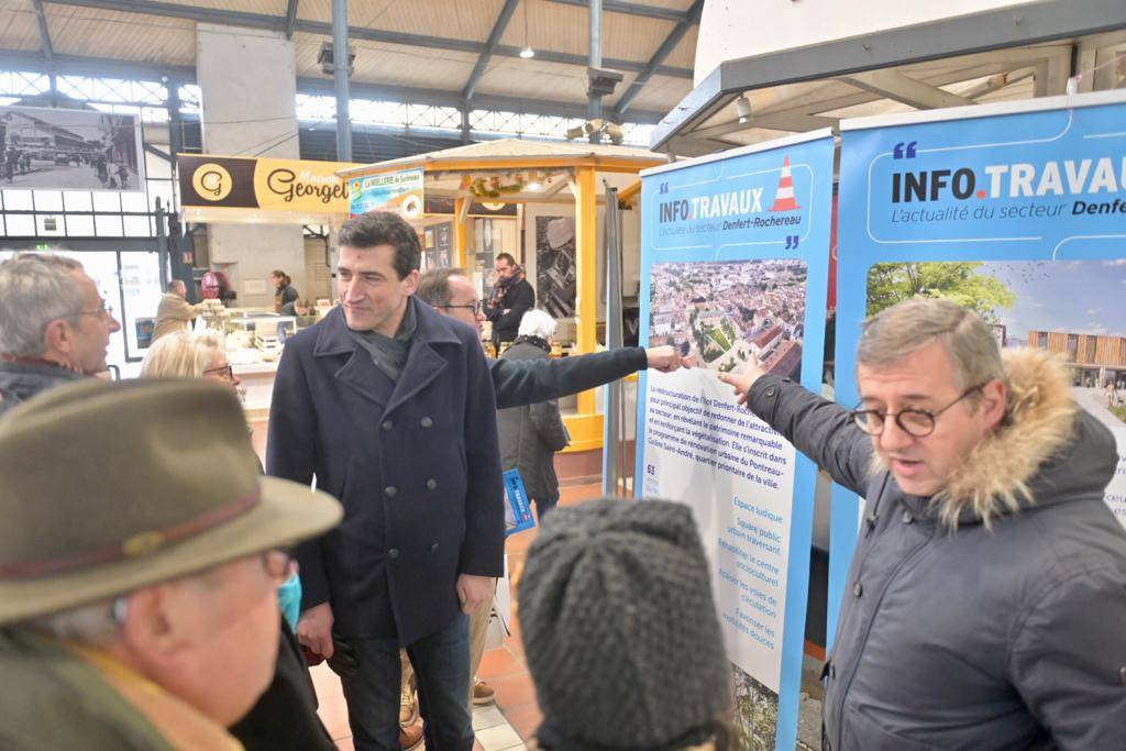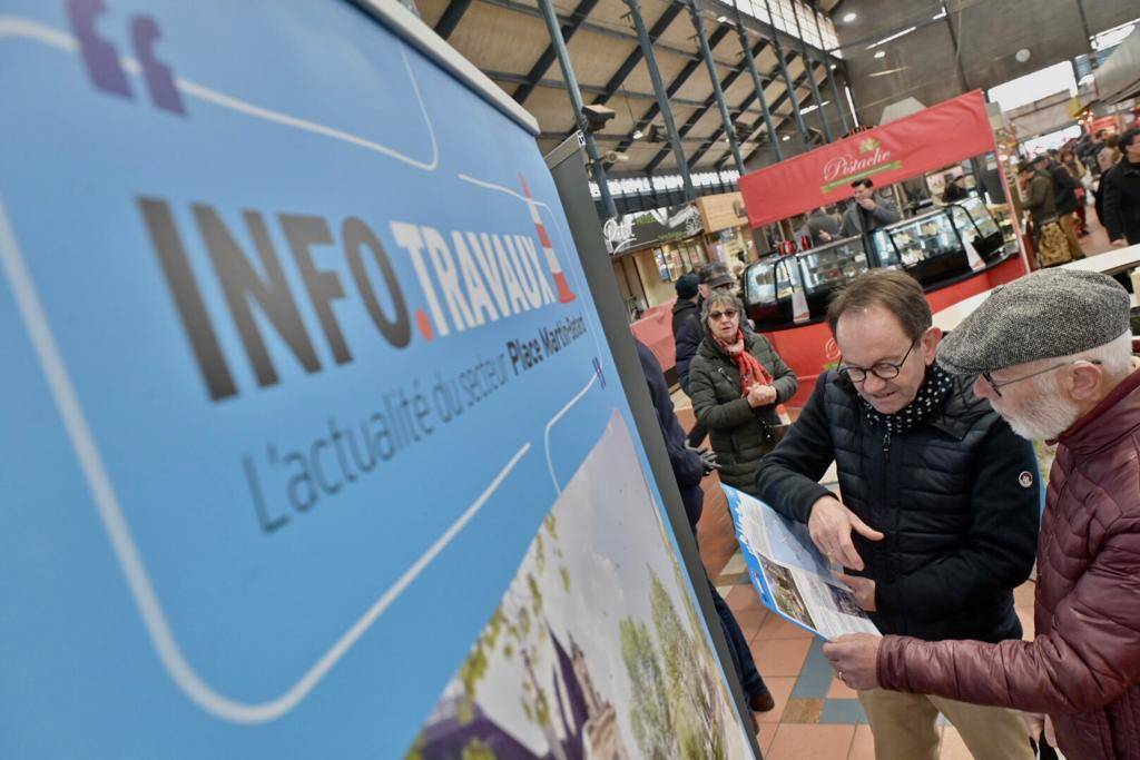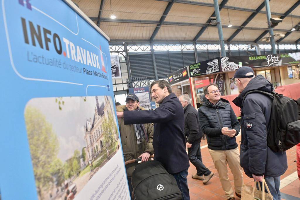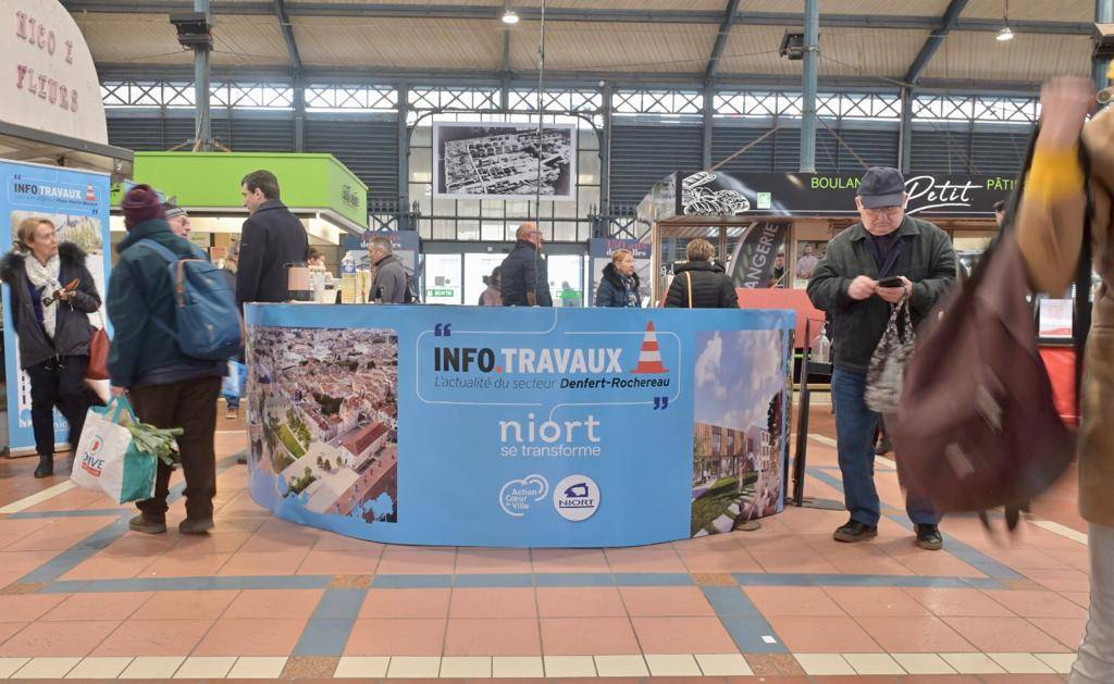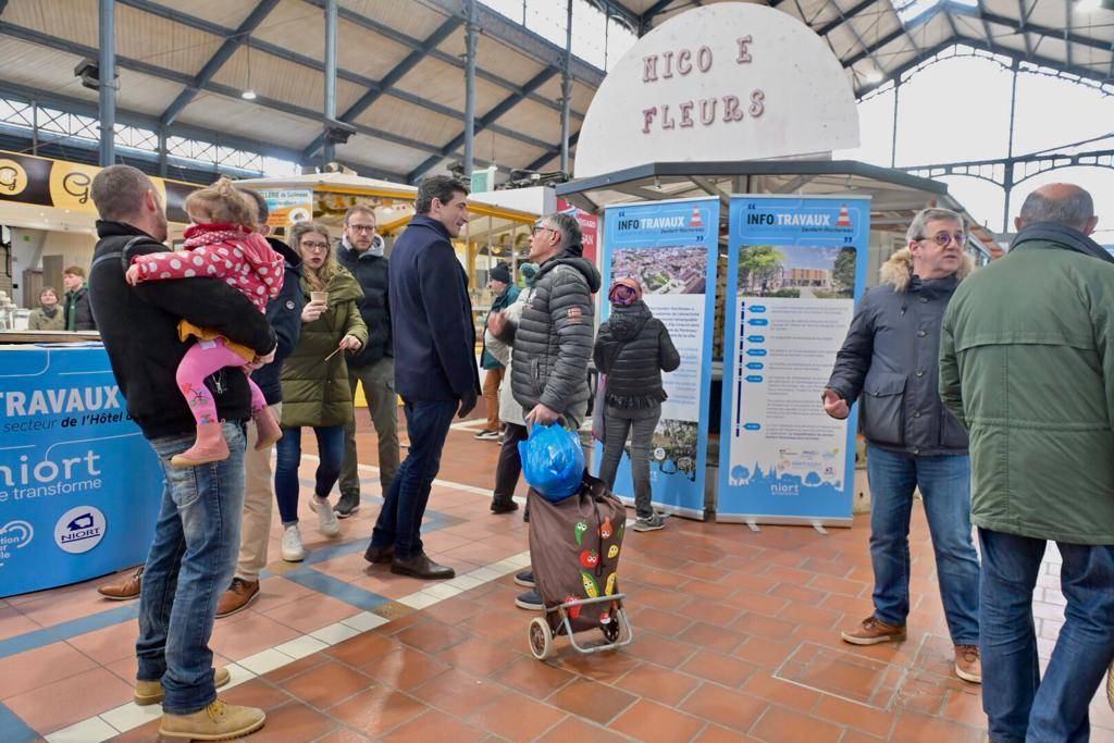 Le maire, Jérôme Baloge, Philippe Terrassin et Dominique Six, ses adjoints respectivement en charge de la vie participative et des espaces publics ont présenté, sous les halles, les aménagements des secteurs de l'Hôtel de Ville et Denfert Rochereau. De nombreux Niortais sont venus ce matin échanger en direct sur ces projets.