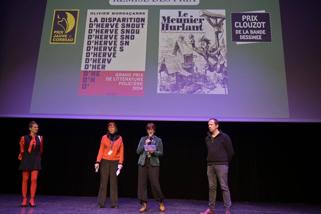 [Festival du polar, Regards Noirs] Remise des prix 2025. Prix Clouzot d'adaptation d'un roman en bande dessinée remis à Nicolas Dumontheil pour "Le meunier hurlant". Prix Jaune Corbeau décerné par le club lecture Regards Noirs, remis à Olivier Bordaçarre pour "La disparition d'Hervé Snout".