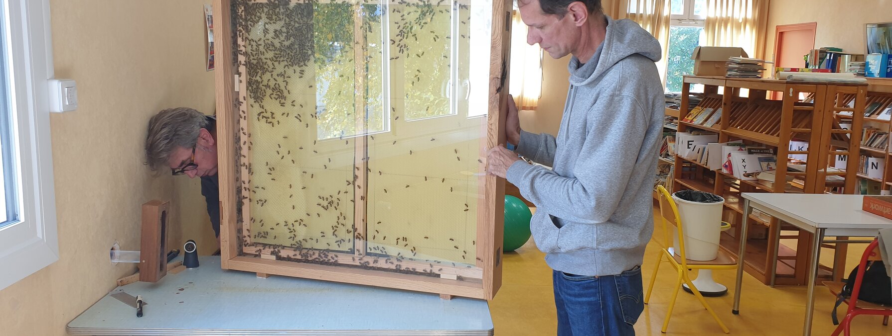 La ruche, dotée d’alvéoles en cire gaufrée, est reliée à l’extérieur par un tube de plexiglas traversant le mur, ce qui permet aux abeilles de gagner l’extérieur pour pouvoir butiner les fleurs alentour. Peuplée d’une colonie d’abeilles, elle devient un support pédagogique de découverte et d’apprentissage pour les écoliers, sur des thèmes tels que la pollinisation, la reproduction des végétaux, les mathématiques, et participe à la protection des populations de ces insectes pollinisateurs. « Toutes les classes viendront observer régulièrement l’apiscope, sans oublier le comptage des entrées et des sorties d’abeilles et d’autres projets pédagogiques », assure Christophe Coubret, enseignant de classes de CM1 et CM2 à Pierre-de-Coubertin. La 1ère colonie y fut installée en 2013. La dernière, disparue à l’hiver dernier, a été remplacée à l’automne.