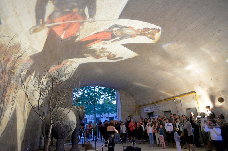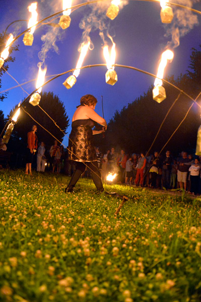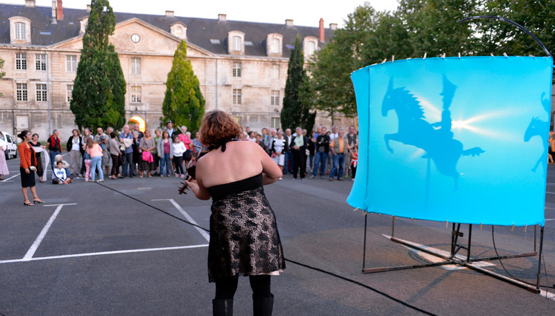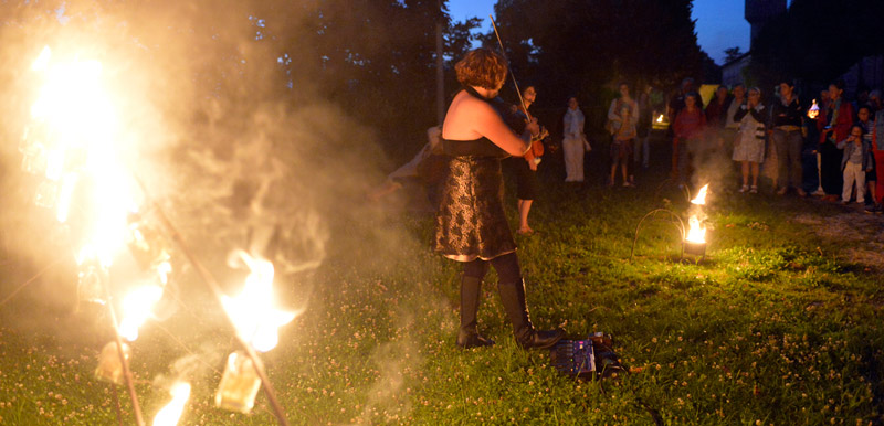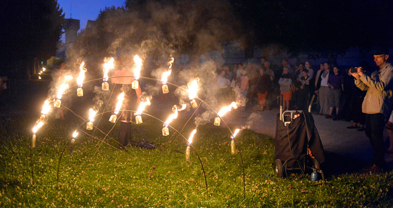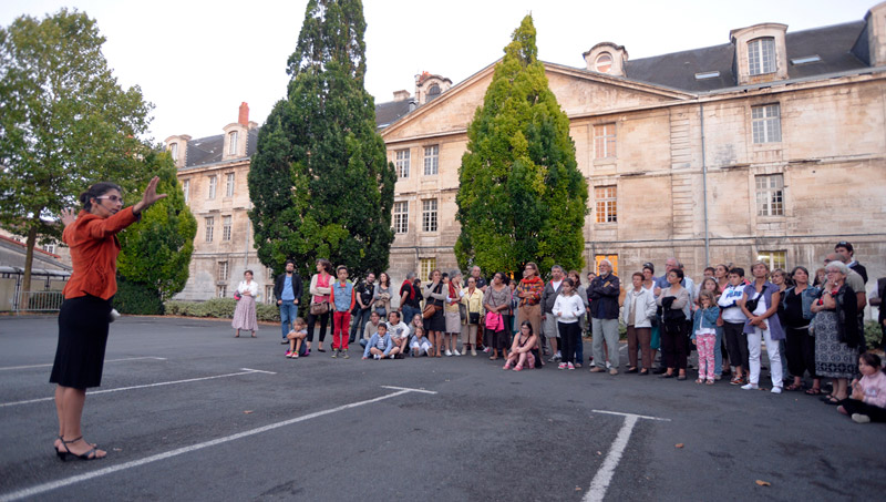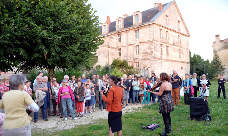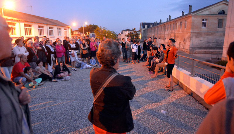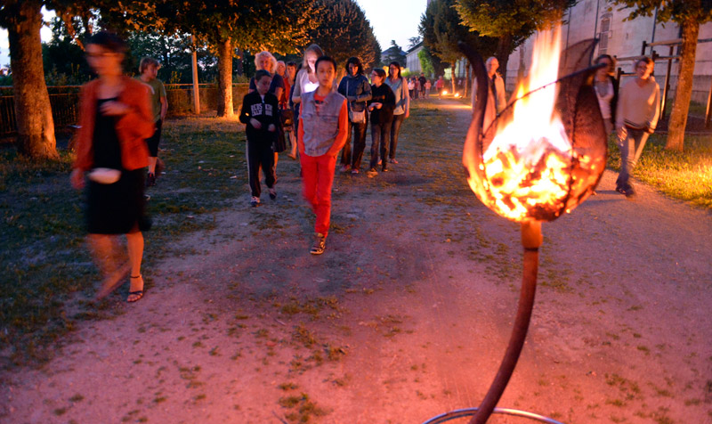 La Scop Atemporelle nous dévoile entre chien et loup l'histoire et l'évolution de l'ancienne caserne Du Guesclin. Au fil du parcours, la musique et les installations accompagnent les interventions du guide. Prochaine visite le 4 août à 21h15. Pour participer, il faut s'inscrire au 05 49 78 74 11. Crédit : Darri
