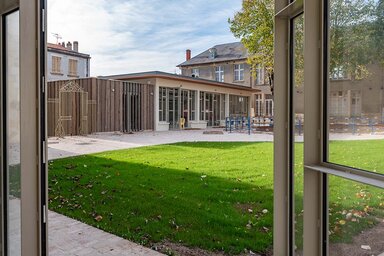 Espace semi-ouvert, ce préau fait office de hall. Il donne accès au centre socioculturel Grand Nord qui occupe le 1er étage de l'ex-bâtiment scolaire ainsi que l'immeuble ancien, protégé au titre de l'Avap, Aire de mise en valeur de l'architecture et du patrimoine (à gauche de l'image).