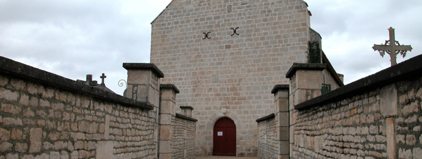 Elle est dotée d'un clocher-porche dont les deux baies abritent chacune une cloche. D'étonnants bas-reliefs, remontant à l'époque préromane, ont été encastrés dans les murs. Ils sont classés au titre des monuments historiques. Leur facture naïve n'est pas sans ressemblance avec les figurations de l'époque gauloise,